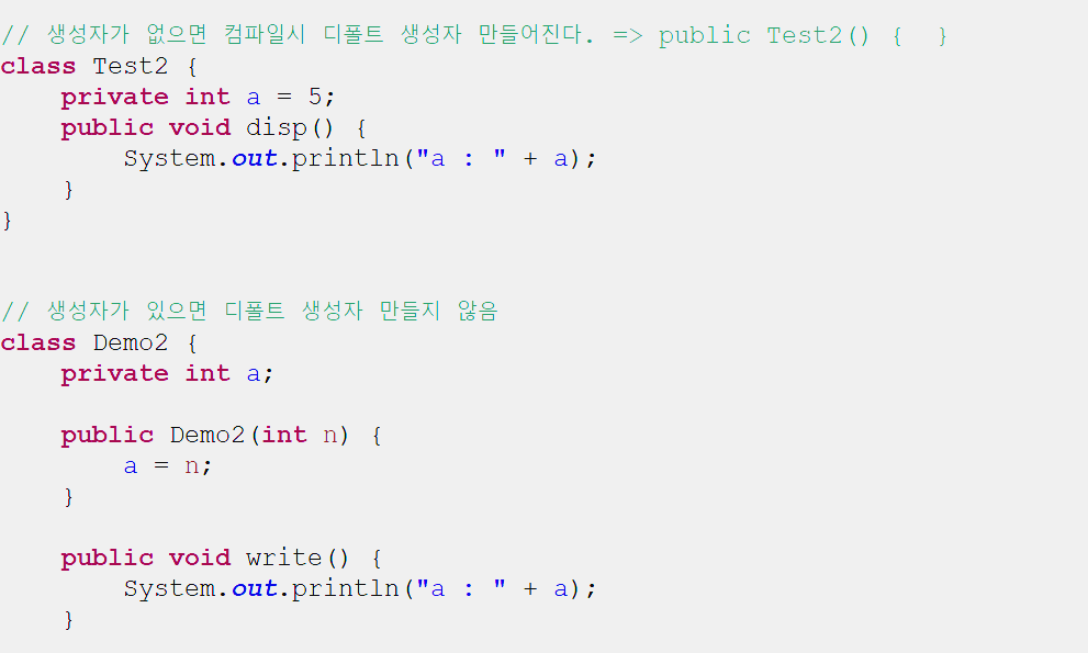 때문에, main 에서 Demo2 생성자로 객체를 만들 때, 인자가 없는 선언문은 오지 못한다. new Demo2( 인자 필수 ) !